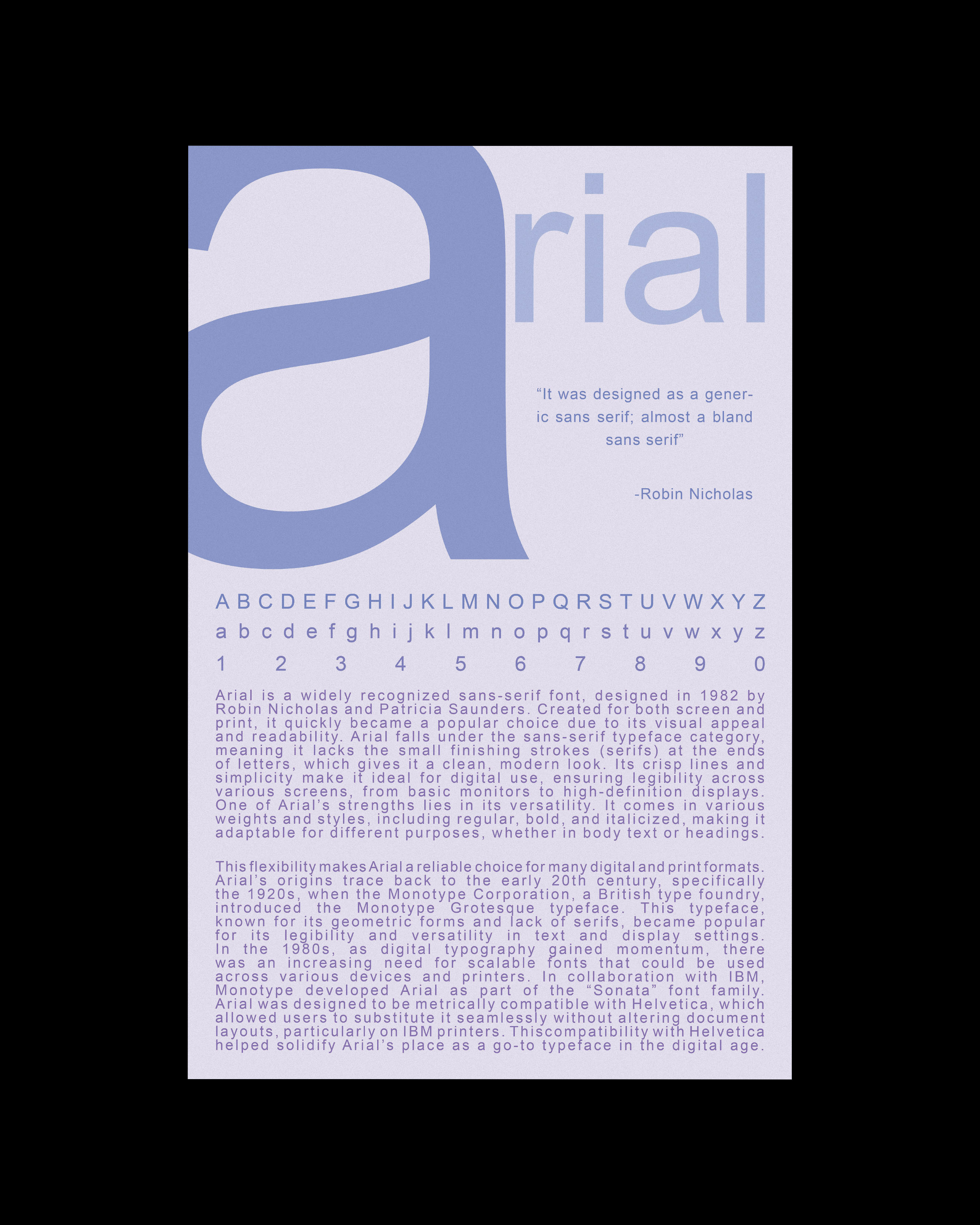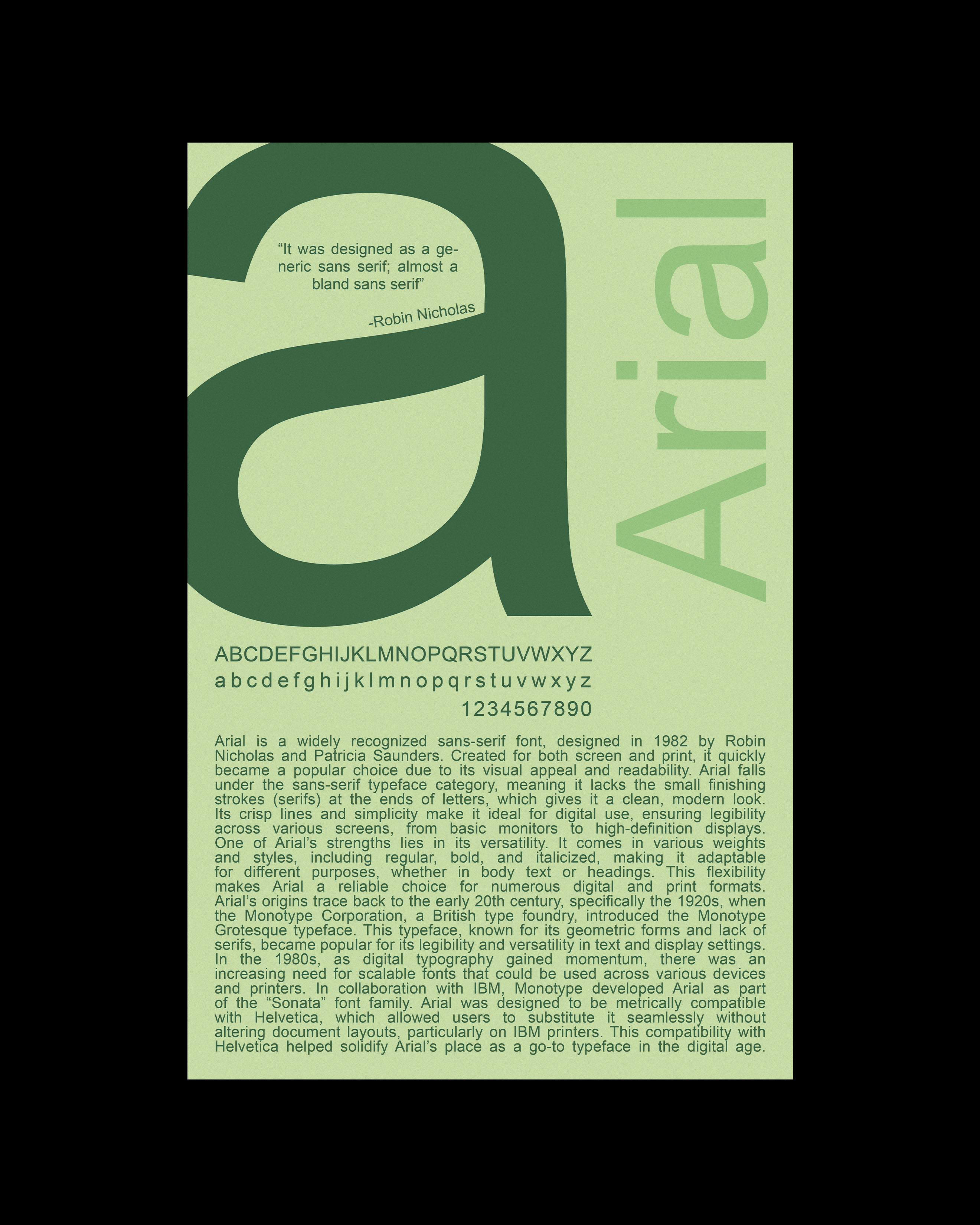 This is a type specimen poster of a single typeface. The typeface I chose was Arial. A “Type Specimen” is often a book that features collections of typefaces, printing graphics, and design layout examples assembled by printing companies, graphic designers, and type foundries to demonstrate their printing capabilities (Type Specimen Books: A KSU Public Domain Digital Collection).